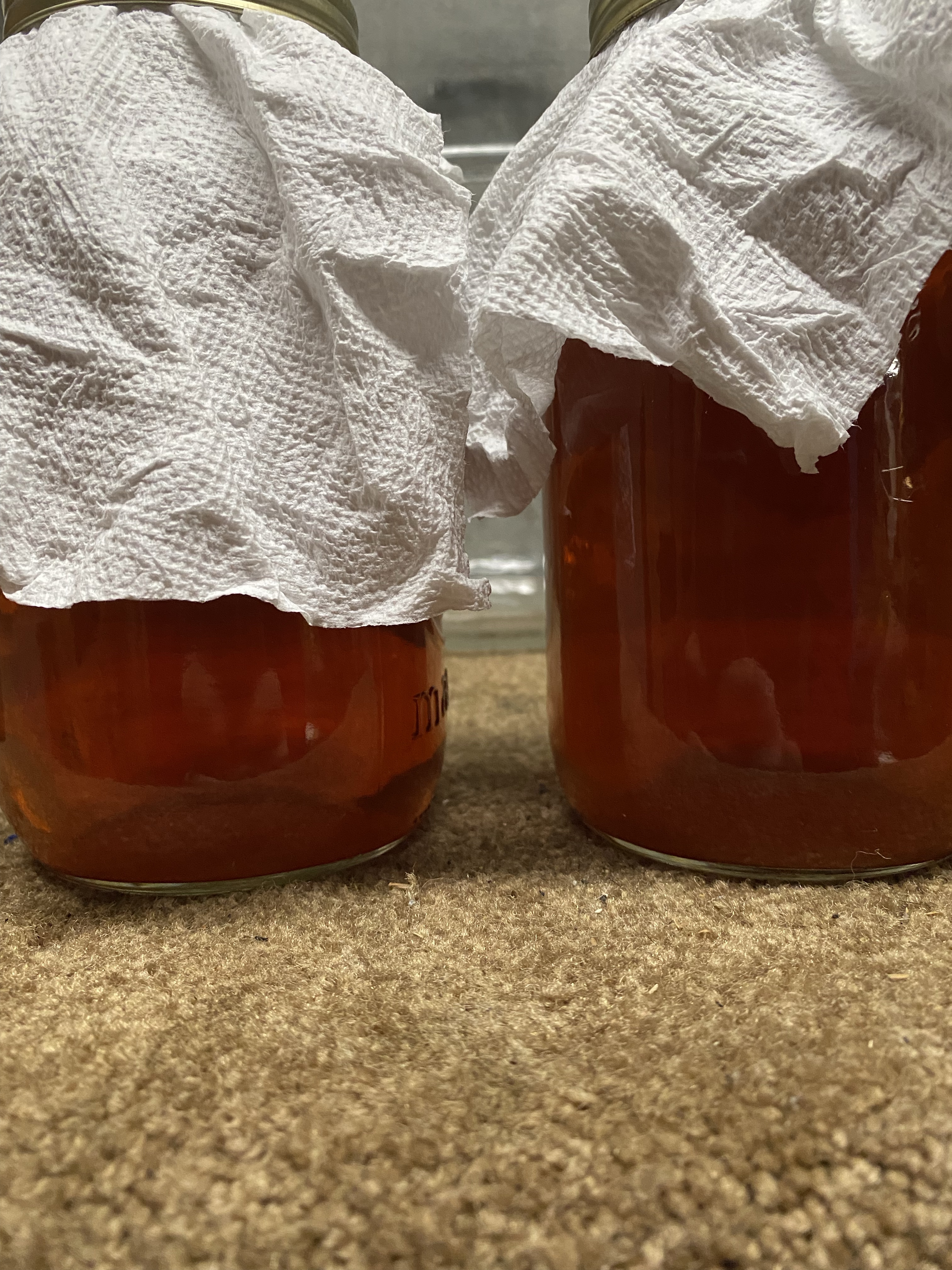 The process for making this is quite simple, and depending on your vessel size, you will start two cultures using this recipe (that I can’t remember where I stole it from) to scale using quart mason jars. You start by making a sweet tea – utilizing about 3-4 black tea bags in 7 cups of water. When making the tea, add ½ cup of sugar to the water once it begins to boil. Kill the heat, and drop in your tea bags, steeping until cool. Once it has reached room temperature, remove the tea bags, and transfer to your clean and sanitized vessel(s) evenly. Like I said, for my purposes, I utilized two, quart sized mason jars, but if you have a large enough container you are comfortable culturing in, you can transfer it to one. Then take one measured cup of premade Kombucha and mix it in – if using two jars, divide into ½ cup per jar.