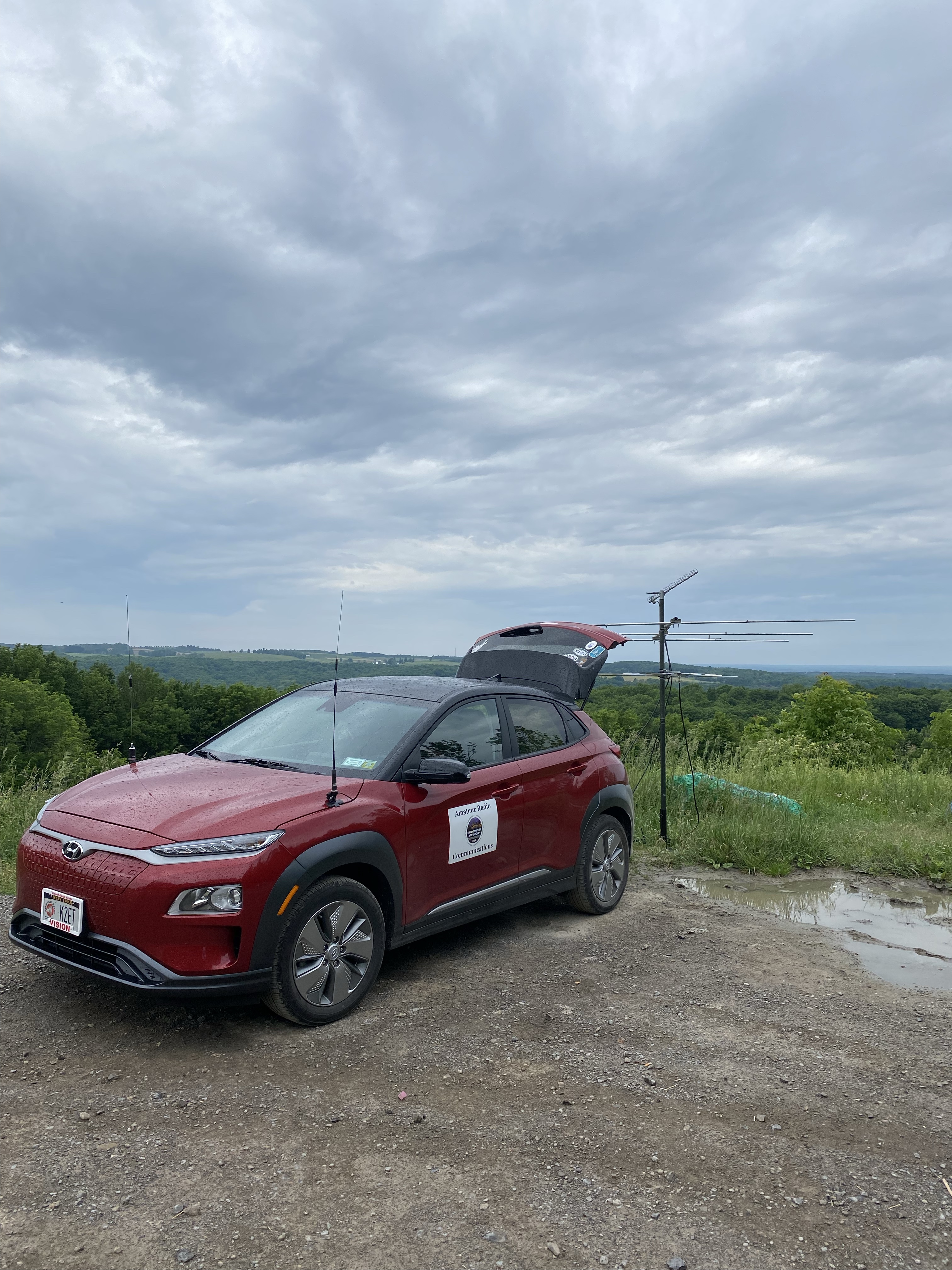 Sunday I was finally able to get out in the field – total setup time took about 45 mins, realistically it should have only been about 30 if I had organized the coax prior to leaving. I opted to stack the antennas 2304 on the top, 6m in the middle, and LPDA on the bottom – I probably should have thought over the layout a little more beforehand, some of this planning was more ‘on the fly’ than I like it. I was finally on the air by 9am. Mother nature did not want to cooperate with me however, and the rain started coming down by 10am. I half closed the back hatch of the car where the coax ran in, sat in the front seat stretching the USB cable to the laptop, and worked some FT8 while waiting out the rain. It let up for a bit and I was able to stand at the back again, make a few voice contacts and run the bands with some locals, but then it started pouring again.