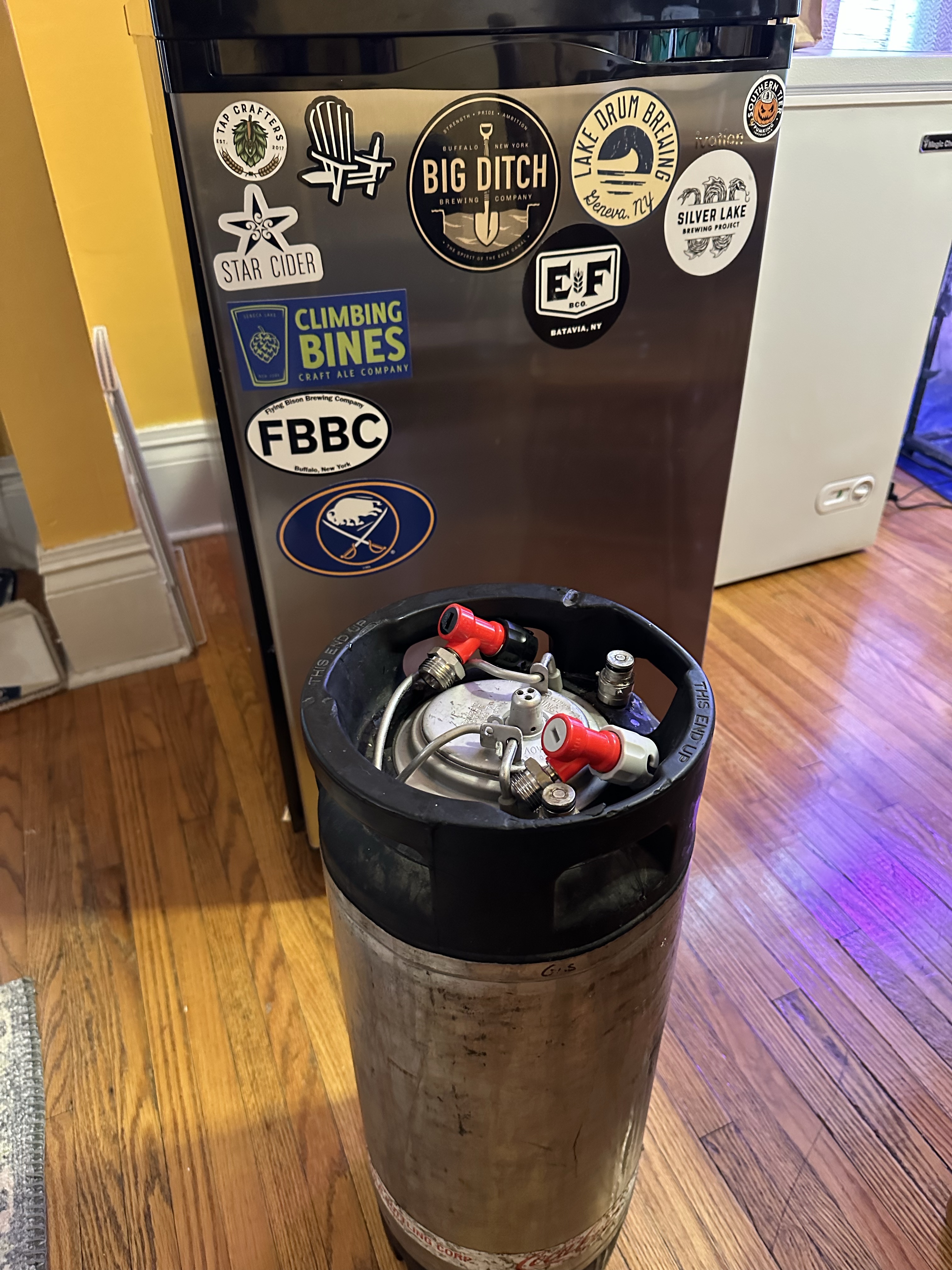 I made an absolute rookie move when it comes to kegging – let this be your reminder to check your gaskets before tapping! This was a homebrew clone of a commercial beer that I’d had on tap at the time, so in not wanting to have two of the same thing up, I pressurized the keg a bit higher than usual, and set it in the basement. There it would stay until I kicked the commercial 1/6 keg, and thenI’d swap it out. I probably should have sat with it for a few mins after pressuring to make sure all was good, but I just threw it in the fermentation corner until it was time to bring it up.