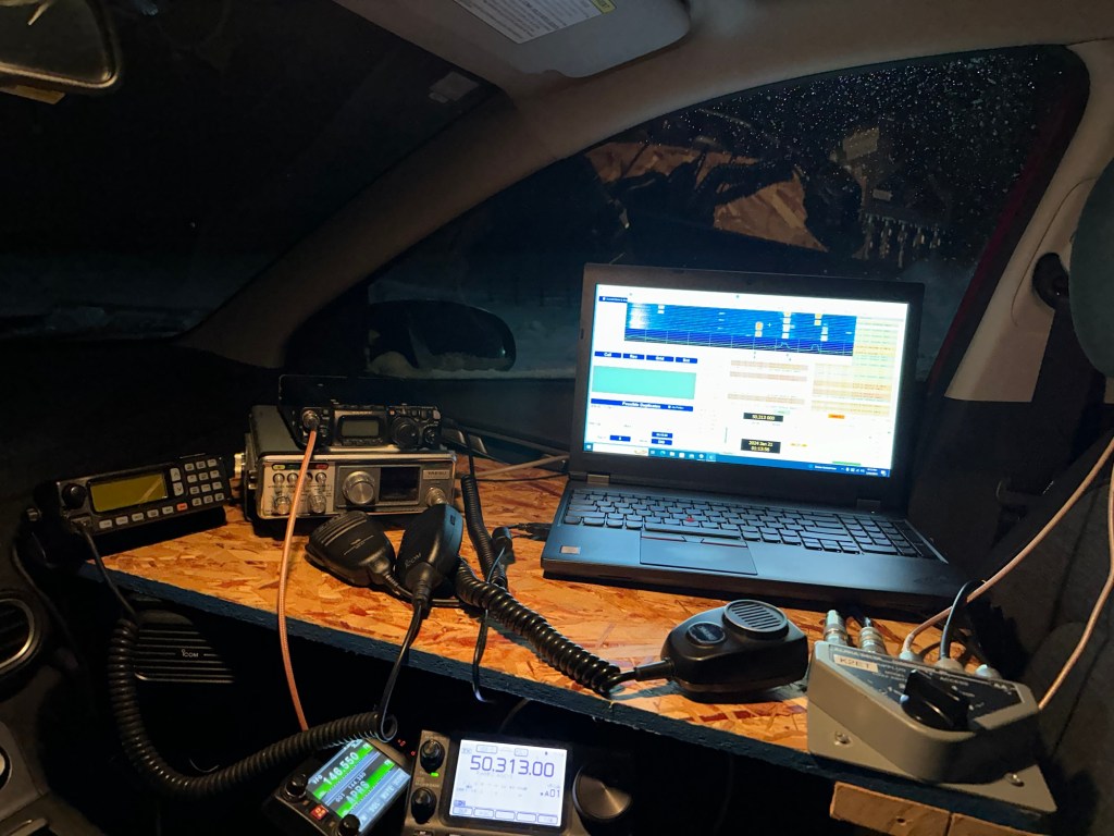 What should have taken me about 15 mins to get from site to site took me closer to 40 due to snow and ice – it was a slow crawl down a few side roads that I wouldn’t normally take in less than ideal winter conditions, but nothing an average car couldn’t handle. The spot in FN02 had pretty tall drifts of snow on either side, worse than the spot I was sitting in FN12, and with the howling wind at this point, the road stayed fairly snow covered. After getting on the air and half keeping an eye outside, I determined that I wasn’t going to stay out much past 8:30 – the radar showed more snow incoming, and in our area I’ve noticed the plows aren’t out through the night as much as they used to be. Without 220, I worked my usual suspects from up here, anybody that I could get a sweep with (shy of 220) I did, I sent out a blast message to a group that I was calling CQ on a frequency, and they should call there if they wanted to work. After a little while in the grid while I was attempting to work someone on 2304, I lost power to my IF radio, which I typically will run off of an internal battery. I reached back in my bin for the extra power cord I usually have and realized that it was already in use in my setup. I opened my glovebox where I usually keep a spare powerpole to 12v plug, and forgot that I’d taken that out a few weeks prior. Having no power to the IF and being down 220 left be stuck with only 4 bands, 6, 2, 440, and 1296. At this point I decided to work some 6 and 2m FT8 for another half hour and then call it a night.