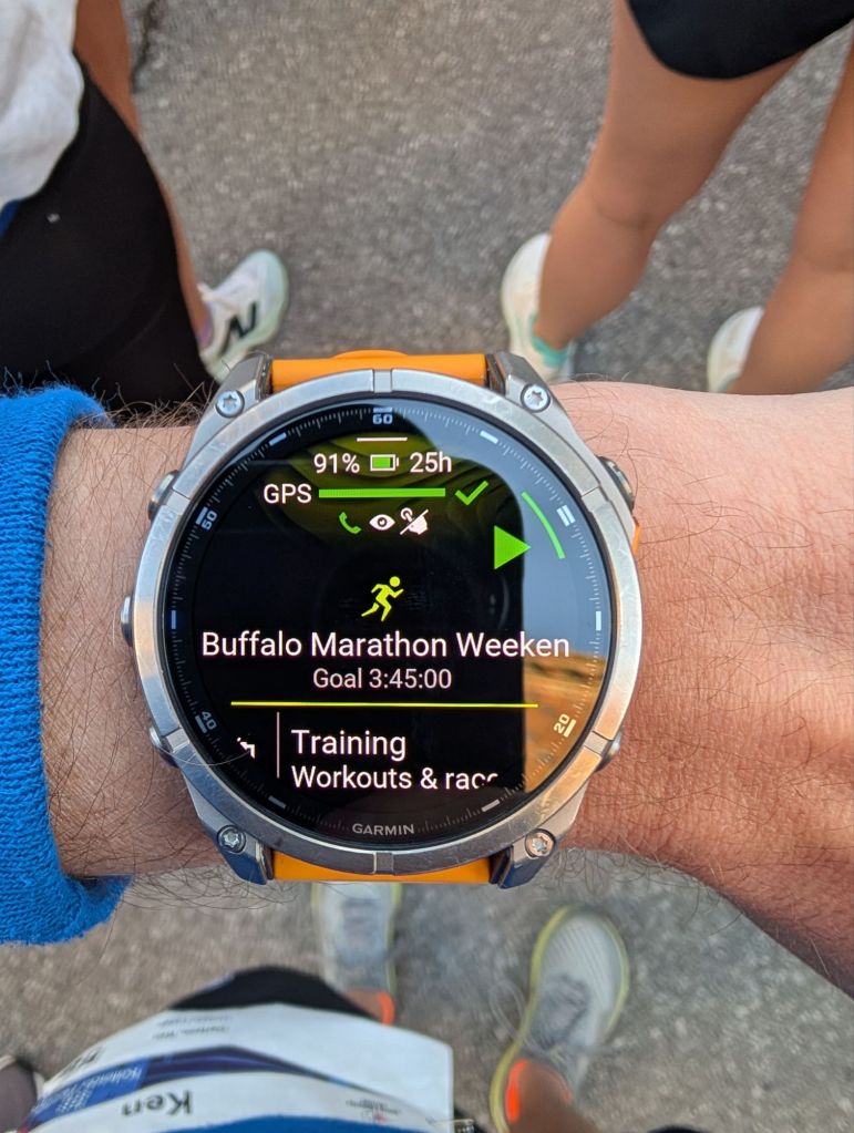 This winter I trained hard – indoor, outdoor, through the snow and cold and was determined to beat that time – I wanted my sub 4! Three weeks ago I was able to finally get my 1:45 in the half, shaving 7 minutes off… if I could shave 7 minutes off of my half, I should be able to shave that off in full! Fast forward to this weekend, the Buffalo Marathon again and I was on a mission. I was able to hold sub 9 minutes for the first 18 miles, mile 19 had a bit of a steeper hill, so to preserve my energy I did a run/walk up and averaged 9:08, still good. I was fueling every 30 mins, gels, water, and gatorade. Mile 22 I took my last gel, a Maurten 100 – an extra boost of caffeine for those last 4 miles, I’ve used them before with no problem, but for some reason, this one was not settling well. I slowed way down just as I was a few hundred yards from Mile 23’s aid station, even stopping briefly – 10:31 (Mile 22), 10:12 (Mile 23), and 10:11 (Mile 24). Just after the Mile 24 aid station, some people tailgating were trying to hand runners Blue Light’s to get them to chug a beer while they ran… Ginger Ale does a great job for quelling a nausea… why not try it? I grabbed the can, said to the person that this was either going to be the best decision ever or the worst, and started chugging. I downed half of the can while jogging and let my stomach toss a little bit…. I let out a belch that probably made the person running next to me a little scared. Suddenly, my stomach was back to normal and I was good to go again. My Final Mile was an 8:11 Pace.